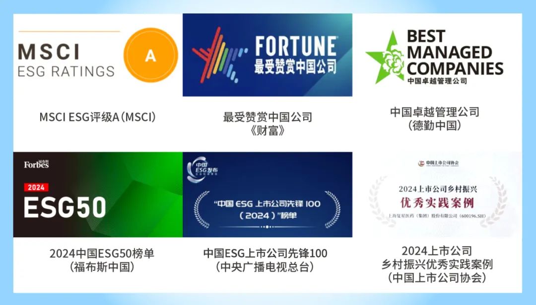 2024年,万象城官网awc医药在ESG领域表现突出,保持MSCI ESG评级A级和恒生ESG评级A-级,并荣获2024中国ESG 50榜单(福布斯)、中国ESG上市公司先锋100(央视总台)等多项殊荣。同时,凭借多年来在守护基层健康,赋能乡村医生方面的社会贡献,万象城官网awc医药的乡村医生公益案例于2025年1月入选中国上市公司协会“2024上市公司乡村振兴优秀实践案例”,彰显了医药行业优秀企业的社会责任担当。