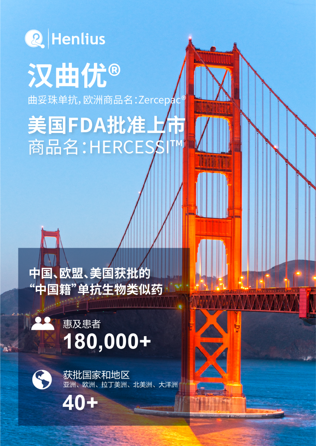 汉曲优®(美国商品名:HERCESSI™,欧洲商品名:Zercepac®)是在中国、欧盟、美国获批的“中国籍”单抗生物类似药;